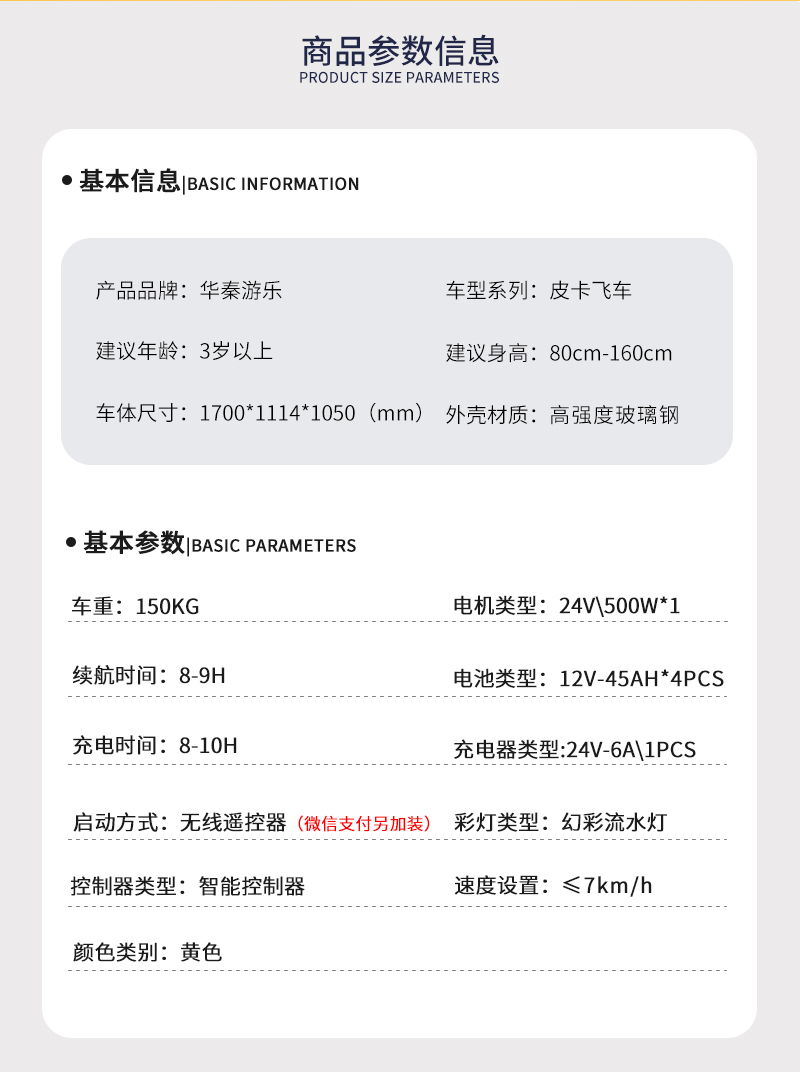 皮卡飞车,皮卡飞车是新推出的亲子双座的广场发光车,采用呆萌的皮卡丘造型,深受小朋友